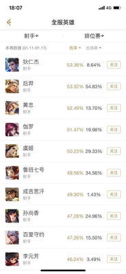 新版本更新,除了百里玄策还有几个英雄胜率也是突增。射手榜,狄仁杰,53.36%胜率,8.64%出场率排在第一,狄仁杰一直是策划喜欢英雄,前期加强之后胜率相比原来49.1%,提升了很多。