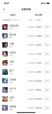 最后一点就是新英雄嫦娥,新英雄大家都很关心胜率,目前嫦娥以41.72%胜率,22.68%出场率排在全英雄倒数第四。新英雄上线大家热度很高,嫦娥胜率不高是因为大家还不是很容易,这个胜率已经不错了,上官婉儿上线的时候首日只有31.55%的胜率,全英雄最低。