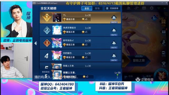 企鹅电竞的人气主播耀神本打算在16日的直播中好好地娱乐一下,但是看到身边的小伙伴和主播们都在冲分的路上有点着急,就立下了不上区一不下播的Flag。