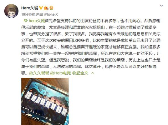 久诚表示,很感谢Hero所有人的帮助。至于转会原因有很多,想离开庇护真正的成长起来,雏鹰总是要离开温暖的家庭才能真正变强。虽然让有些粉丝失望了,但是以前的共同经历的荣耀是无法改写的。
