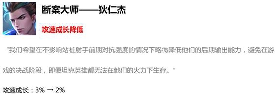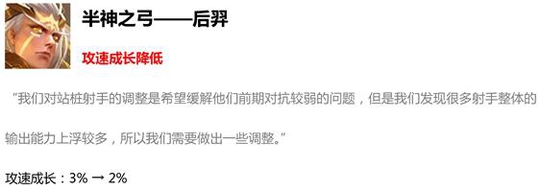 后羿的胜率在射手榜中一直都高居不下,而且出场率也是全英雄第一,由此可见这个英雄还是有点太强了,本次改动对他的攻速稍微进行了一些削弱。