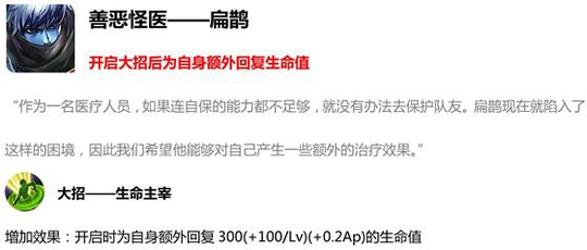 扁鹊的最大问题就是自保能力太差,尤其是碰到高爆发或者战士冲脸,扁鹊基本上没有什么反制的手段,这次改动增强了他的回复能力,相信之后会比较多见了。