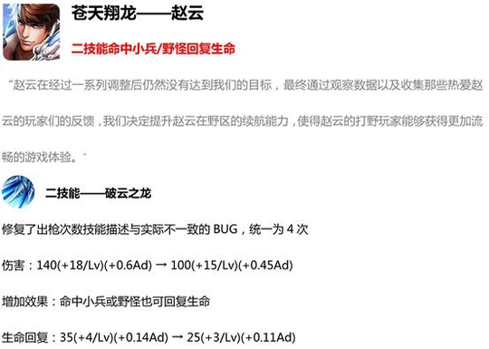 赵云的2技能现在可以出枪4次,这就对总伤害是一次加强,因此2技能的直接伤害进行了一定的削弱,而最关键的就是赵云增加了续航能力,打野效率要起飞。