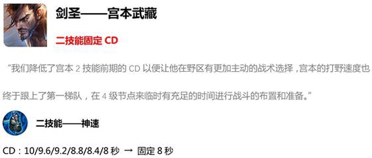 宫本自从上个新版本更新后已经加强过了一次,表现也是非常的不错,这次又将他的2技能cd固定到8秒,这下宫本武藏真的要崛起了。