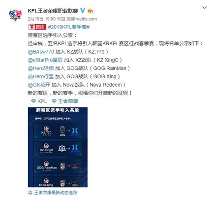 电子竞技请外援是一件很正常的事情,不过按照其他游戏项目上的经验来看一向是中国请韩国外援,但是王者荣耀最强的还是中国。目前KPL官方已经宣布5名KPL赛区选手正式加入KRKPL赛区,分别是BA770、eStarPro星辰、Hero轻雨、Hero行星、GK花开,分别加入KZ,GOG,Nova战队。