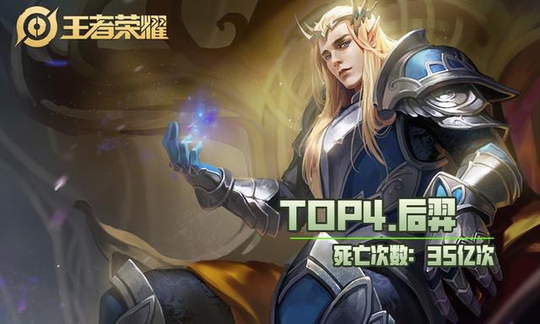 排名第四的是后羿,出场率是全英雄第一,很多玩家开始还猜测死亡数第一的肯定是后羿,不过这个英雄目前版本比较强势,胜率也是和狄仁杰来争夺射手第一,目前很多玩家也是用后羿来当做自己的上分英雄,虽然没有位移,但是伤害非常爆炸。