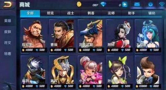 当时的英雄购买界面。所有英雄的购买价格都非常便宜,大部分都是4888金币,连现在必须要用点券买的嬴政,在当时也只需要4888金币就能买到。而且现在没人用的刘禅竟是当时最贵的英雄。