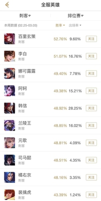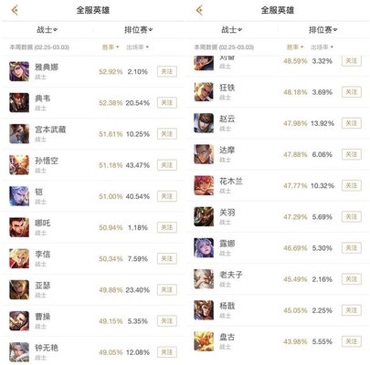 3月已经到来了,寒冷的冬天渐渐过去,春天已经缓缓到来,又到了我们每周固定的胜率榜时间啦,上周王者峡谷没有什么大的变动,但是调整了四位英雄,亚瑟、米莱狄、狂铁增强,阿轲削弱,所以现在我们来看看对全英雄的胜率有没有什么影响。