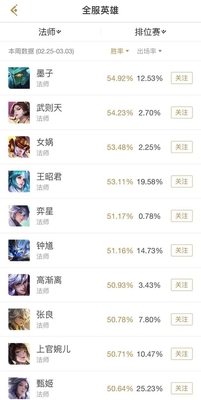 法师榜 ,米莱狄增强了之后虽然胜率上升,但是依旧没有就进入法师前10名,适合上分的还是像 王昭君 这种操作比较简单的法师, 53.13%胜率,19.13%出场率 。这边隆重安利一下 女娲 ,常关注胜率榜的人应该知道女娲胜率常年在前几名, 53.37%胜率 ,但是出场率一直很低,只有 2.19% ,女娲的被动很强,增益范围内的友军伤害,3技能的被动会在受到伤害的时候给自己产生一个护盾,往往就是这个护盾的增加会救她一命。真的很强。