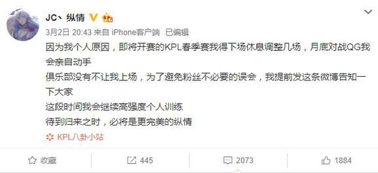 一般来说比赛还未开始,狠话总是要先行的,比如JC的纵情,前几日就在在自己的社交平台发文表示,因为个人原因,开赛前几场将不会上场,继续训练,完善自己,但是月底对战QG会亲自“动手”。