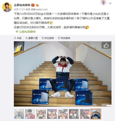 大家熟知耀神可能是因为他的李白,素有国服第一李白的称号,并且直播很搞笑,频繁出表情包,既能学到技术又能看到段子。还有一个重大消息,就是耀神发文表示将会在3月9号进行600万粉丝回馈,届时会有一大波礼物相送,5台PS4,两台华为mate20PRO手机,4支YSL的口红,12只王者荣耀联名的口红,Switch,还会有各种的现金活动等等。可以说是很豪了。