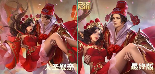 大圣娶亲也是对两个英雄的面部做了调整。露娜的两个版本中,最终版的眼神中散发着光彩,旧版中眼神无光。孙悟空是抬头的角度进行了调整,最终版的角度下也更显得孙悟空的阳光。