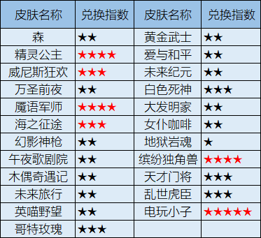 注明:以上皮肤兑换指数仅是个人评估,不带任何歧视色彩。