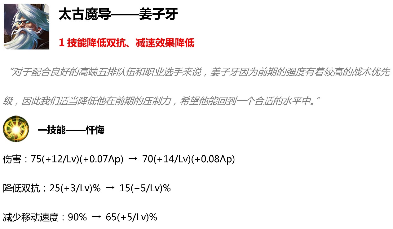 总体来讲类比后羿,下调了姜子牙在前期的强度,中后期等级成长上来之后,姜子牙的技能效果等影响不大。