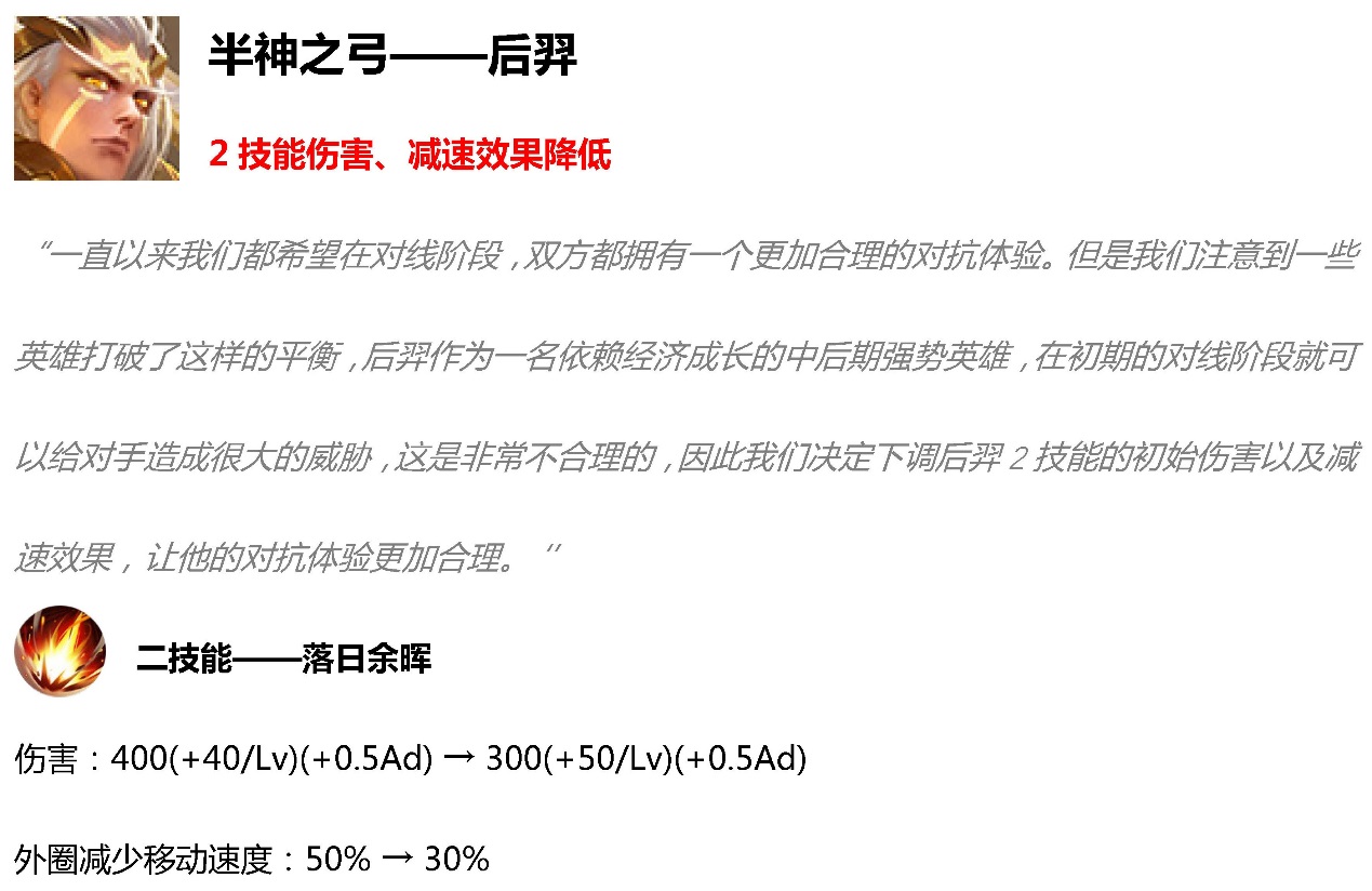 总体来说,此次调整下调了后羿的前期压制力,但是后期经济装备发育良好的话,后羿依然是那个站撸一切的后羿。