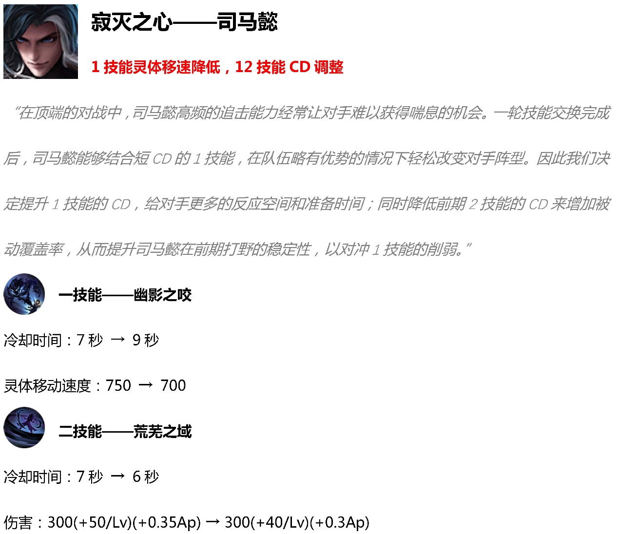 评价:司马懿的灵活性大家都是有目共睹的,此次1技能的调整不仅把1技能的CD上调了两秒,还把幽灵的移动速度也下调了50点。这样在前期的支援或者gank上司马懿的灵活性就差了一点,也给了对手准备反制手段的准备。