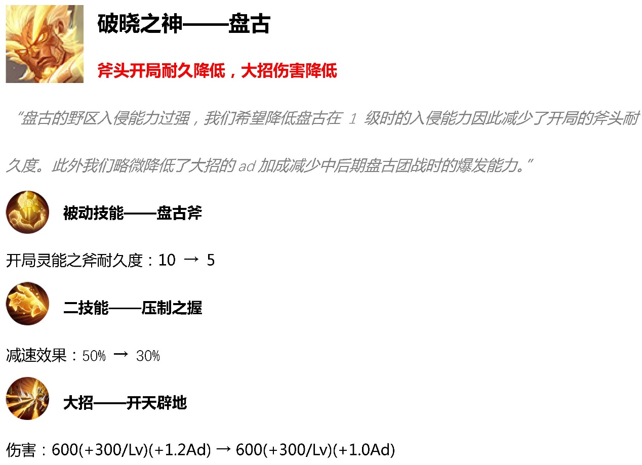 评价:盘古真的是很强的一个英雄了,特别是打野盘古。特别是在职业赛场的表现,前期可以砍10斧头,配合斧子的百分比流血效果,在野区的作战能力是其他打野不能比拟的。此次调整对于斧子的耐久度做了调整:开局灵能之斧耐久度:10→5,即开局普攻五下敌人就会切换为双手形态,要知道盘古斧子形态下是可以给敌人添加百分比流血状态的,这样不至于让盘古1级的时和敌人对抗时过于强大。二技能减少移动速度:50%→30%,降低了盘古的留人能力,总体来说主要是对盘古的前期作战能力进行了调整。再者就是大招的AD伤害下调,降低了后期团战时盘古的大招爆发伤害。