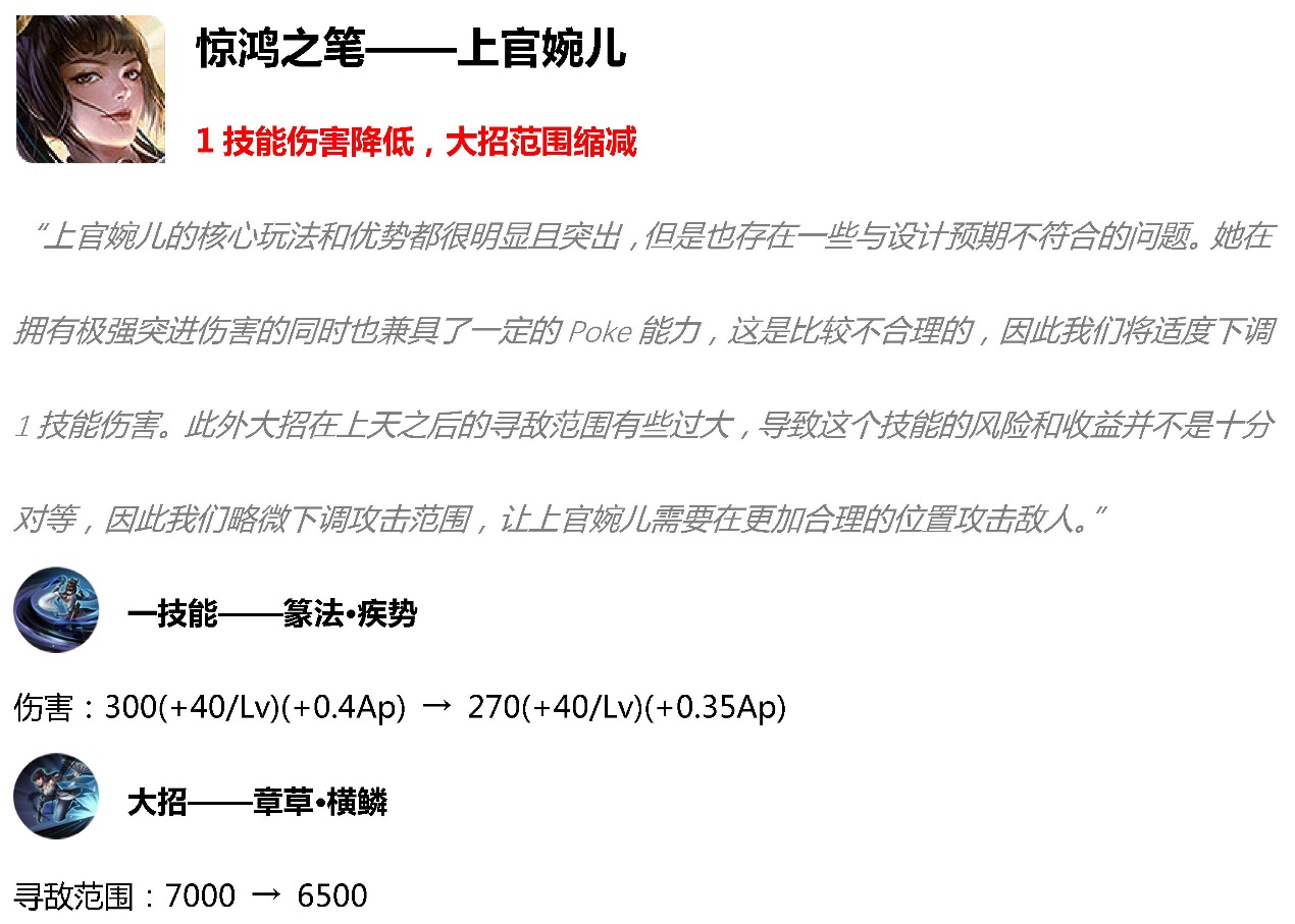 总体来说此次调整下调了婉儿的消耗能力,和大招的威慑力。