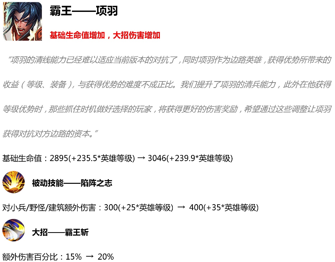 而且大招的被动额外百分比伤害也做了上调,这也意味着四级之后的项羽对残血敌人的威胁大大提升了。所以这次调整之后,项羽不仅仅可以打辅助位置,将会是强力的边路坦克英雄之一了。