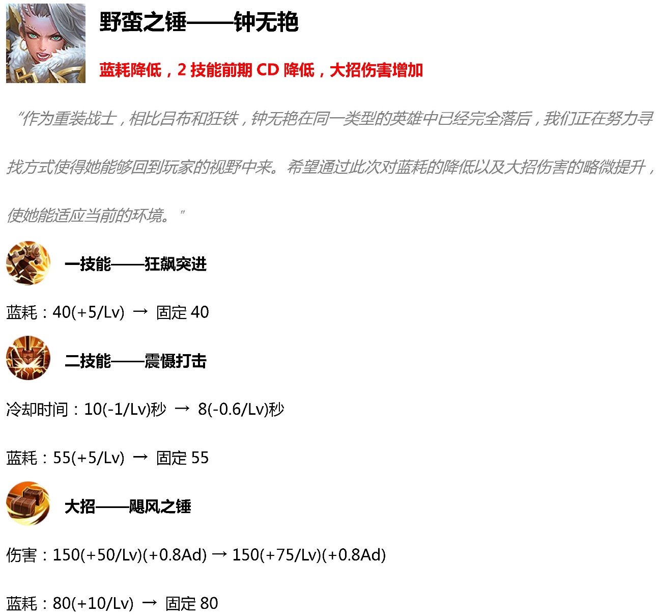 评价:对于此次蓝耗的全面下调,我觉得可以让钟无艳这个依赖技能制造伤害的战士在对线上可以更加强势了。同时还把大招的技能等级成长伤害做了上调,都使得钟无艳在线上的伤害能力大大提升。