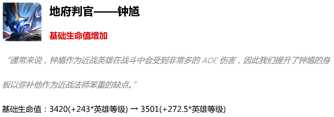 评价:钟馗的这波生命值上调很强啊,本身2技能就有被动可以混助攻和击杀来增加自身的坦度。可惜的是没有关于技能伤害方面的调整,总体来讲,聊胜于无。