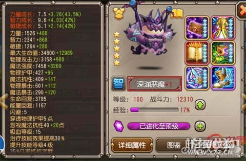 4.这套阵容里深渊恶魔就主要起控制的作用了。天怒双子击退的效果不错,夜魔再将敌方后排大飞至前排,深渊恶魔的AOE伤害和控制配合天怒大招能达到不俗的输出。