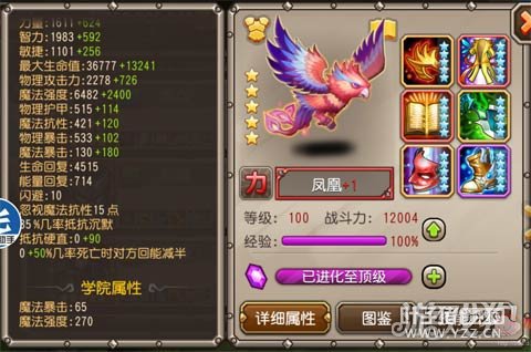 最大生命5万 魔法强度:8882 魔法爆击:310 忽视魔抗:15 书院属性 魔法暴击:65 魔法强度:270 凤凰技能