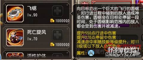 飞锯就是伐木机扔向对方人群中的那一个盘子,这个盘子的持续时间不短,伤害虽然不高然而重要的是它的减速效果。对于一姐来说,站着普通攻击就是输出,而减速恰恰正好限制住了她的输出。 2.小技能死亡旋风