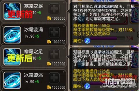 提升了每秒受到伤害的效果,从原来的1150点到1725点,持续大概4秒的时间,并且小幅距离的移动不能解除霜寒之足的效果。 寒冰漩涡新增效果:小幅降低受影响敌人的受伤回能。