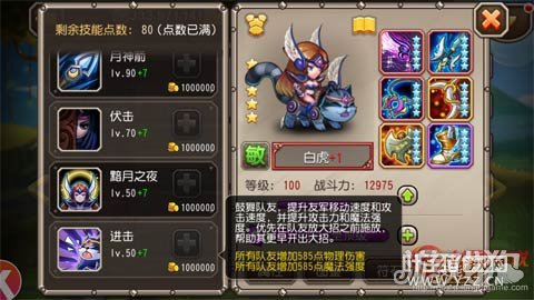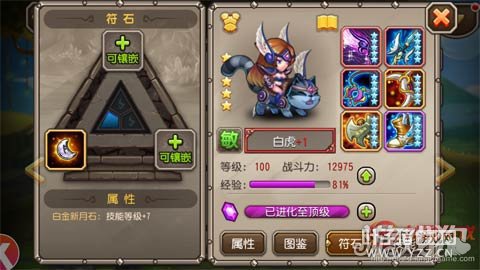 白虎的二觉技能与虎跃类似,只是并不释放在开场,自动或手动战斗均不能控制其触发,会自动在有队友将要或已经满能的时候,起到一个和虎跃技能类似的效果(加速效果不知是不是25%,提升的物理攻击和法强与虎跃相同)。实测中这个技能的CD很短,持续时间大约在5秒左右,由于虎跃技能全场只是开场释放一次,而加上二觉技能往往可以将全场的加速鼓舞时间放大至2倍以上,辅助能力提升幅度不小。二觉符石的问题我推荐下面这套,对于老区非土豪应该是最佳选择了,提升其辅助能力又节约石头:
