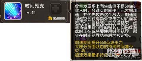 神化技能时间预支,大致意思就是虚空侦测生命值不足50%的敌人标记敌人并对其进行优先攻击,在此期间虚空会进入一个加速状态(加速幅度很高),小幅提高攻击力并且在加速中减免60%的负面效果(冰冻、眩晕等)。当虚空的标记目标死亡后,虚空会进入定身状态,不能攻击但可以触发时间回溯技能闪避伤害。 被定身的时间从虚空加速开始的时间开始算起,直至击杀被标记目标。
