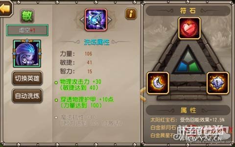 洗炼:三个属性都还可以,前两个属性增加攻击性,第三个属性弥补魔抗弱点。不过虚空在当前竞技场的大敌并不是法系队伍,她并不高的闪避对阵当前输出较高的美杜莎队伍来说是一大弱势。推荐22级以前可以双洗,23级以上的洗炼等级可以三洗虚空。 符石:作为三星虚空党,首要就是保障存活。 符石思路就是快速开大收割,虚空的物理暴击不高,而且攻击单次输出攻击比较低,主要依靠大招的连击进行收割,所以虚空加速后副作用最小以及最快的收割方式无疑是大招,所以太阳石我选择受伤回能。 第二个属性我选择了减少控制时间,肯定有人会觉得奇怪,虚空神化技能自带减免60%负面效果为什么还要选择减控?其实实战中我也发现虚空自带的减控效果仍旧不够用,特别是开大后跳入育母蜘蛛的领地之中,每浪费1秒时间就会使副作用的时间延长,所以我选择了减控。 晨星石的选择范围就比较广了,可以选择生命值/攻击力或者敏捷,看个人取舍。 【竞技场篇】 神化虚空具有监测虚弱队友的特性,所以组队中选择美杜莎等具有范围攻击技能的英雄,毕竟虚空的收割往往是从中后排入手。 总结:此次神化虚空的特点鲜明,神化技能是一把双刃剑,就看你如何使用。其加速后的攻击性极强,如何配合队友最小化虚空的副作用并最大发挥其神化技能的价值是需要多多琢磨和思考的。此次神化我对于虚空的表现算是比较满意的,而且在周五也即将登场虚空的皮肤,为其续航能力再次进行强化。总体来说虚空是一个值得神化的英雄,当然神化的代价也略高。在本月魂匣和虚空之间取舍也是万分纠结的事情,建议没有足够钻石的朋友可以在本月魂匣测评后再进行定夺。 神化评级:A [编辑:叶子猪小秘书]