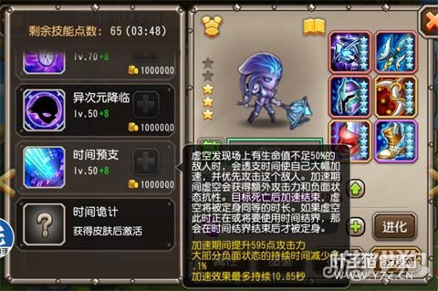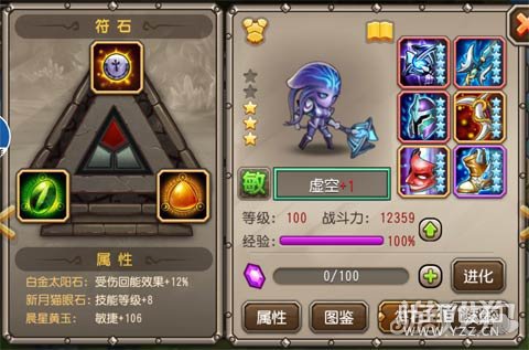 符石的选择我选择了受伤回能、技能等级和敏捷。 技能等级可以换成减少控制。 之前也说了,虚空的关键在于她的大招能否开出,那么增加受伤回能就很必要了,全为她的大招服务,技能等级为了增加她的闪避几率和各项输出,敏捷则是为了更好地增加输出。 4.神化技能