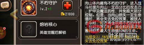 小技能不朽之守护,肉山死亡给对手英雄一个避免一次死亡的状态,点满技能后在肉山在损失50%血量前都处于免控状态,帮助肉山在前期持续输出的神技,会给对手送盾是肉山唯一的副作用。