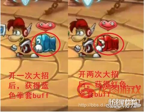 大招蓝色拳套,雷曼在释放大招以后获得一个拳套buff,之后的每次攻击都会附带一个单方向贯穿全场的一个物理AOE攻击,如果大招释放两次,则蓝色拳套变成红色,伤害提高并且获得持续伤害效果。