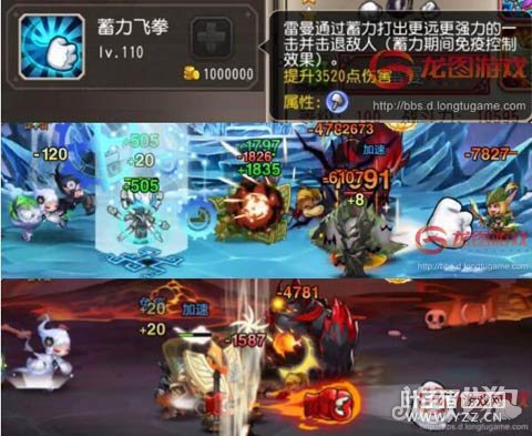 蓄力飞拳(普通):蓄力攻击也是属于大范围攻击,可以攻击到后排,也就是说是敌人的全部。攻击力也还可观,5000-7000的攻击。