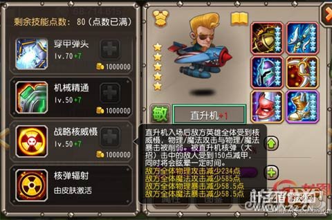 重点来看飞机二觉技能“战略核威慑”,该技能可以做两部分理解,一方面为飞机增添一个削减敌方输出的光环,另一方面对飞机大招进行强化。光环对敌方全体的物法攻击力、物法暴击能力均进行一定程度的削减,虽然数额不大,但一定程度上增强了飞机自身和我方全体的生存能力。而对大招的提升是使得大招命中的单位额外被眩晕和减甲150点,经过测试发现减甲时间是持续整场的,再加上“皮肤”提供的100点减甲,也就是说飞机大招命中的敌方单位将永久性被减甲250点!如此高额的减甲使得后期战斗中无论是飞机自身还是队友的物理伤害都能对敌人造成更严重的打击,更是使得飞机在团本中将拥有非常核心的地位,在不少关卡中获得出场机会。