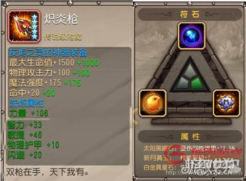 二、装备符石 神器装备加强的攻击力200和魔法强度350,生存2500的血量,命中40都是对于火猫来说很好的属性。装备上洗练的闪避+20非常有用,所有火猫最低要双洗,有条件的话可以三洗200,还有个吸血+120的也非常实用。 符石方面,结合神器技能是持续伤害技能,需要越快放大输出越高的特性。受伤回能就成了首先选择的符石,而技能+7提高所有技能的伤害,生命值是增加生存能力与续航能力。