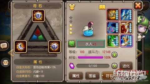 皮肤技能为、当水人受到致命伤害时,免死一次,并且2秒内免疫物理伤害。 在实战中,水人大概在30到45秒左右能释放四次技能,有了皮肤的保护后,会增加触发二觉技能的机率,总的来说而且二觉和皮肤技能让水人生存能力进一步提升,但是由于水人攻击技能缺乏,在战斗中作为无法作为单主力,应该搭配其他暴力输出英雄(PA、那家、虚空等)。文德认为,作为三星水人而言,对于里面还应该搭配奶,或者护盾英雄,或者是白虎之类的抢显先手的英雄。 四、水人符石选择 在如今物理当道的情况下,为了防止被大娜迦,波斯王子等英雄打断,应该搭配闪避加18的新月石头。为了尽快释放大招,达到输出和尽早触发水人二觉技能的目的,应该搭配受伤慧能的太阳石头,至于晨星石头,就见仁见智了,我选择的是力量加成100的晨星石头,可以提高水人的生命值和抗击打能力。