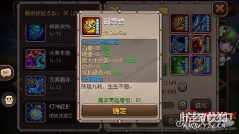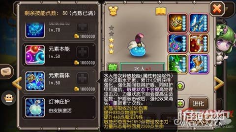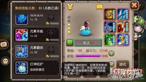 二觉技能的说明又长又臭,简单的来说就是释放除属性转换外的技能4次后,获得护盾,和护甲、魔抗的增强,绿水人增加攻击力,红水人增加生命恢复。