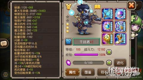 3、总体属性 前面说到无论是神器装备+符石+信使装备,干扰者的闪避可以达到82点。那么也就有了在幻刺、波斯王子、编织者、黑龙等专门切后的物理输出英雄面前生存的资本。 3星无信使装备的干扰者还是比较脆的,血量4万2相比育母的5万5整整少了1万多。护甲在神器上有所提升达到了643点、魔抗462都还比较高(在后排来说)。输出方面不用考虑,干扰者的大多技能属于辅助类,伤害较低。