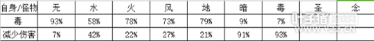 这是测试表格,测试数据浮动根据不同的怪物大约在3-5%,但绝不会差太多。 这里解释一下:每个属性怪的特点是3-4下普攻会夹杂一下比较高攻击的属性攻击,这些数据就是针对这些属性攻击所做的测试。(而且所有怪的普攻也有减伤,参考无属性) 以下图片就不一一说明了,纯手码,供参考:毒属性全部都是减少伤害,没有增加伤害的! 暗