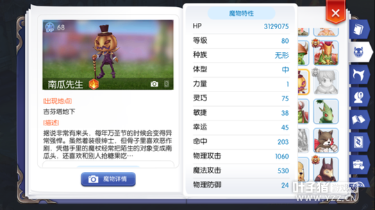 当然并不是说我这一套才是打mini的入门装备 即使你仅有一把刺藤,身穿无洞的紧身衣和布袋熊鞋子照样可以打 因为我就是从这些基础装备开始的,只要能够摸清mini的技能和套路,利用好属性相克, 肯花点钱投入到消耗品上,便没有什么难以应对的敌人,装备便也很快能够成型 我的思路是与其花钱在看不见底的精炼与附魔上不如先把钱用在实打实还不贵的减伤上, 优先确保生存,随后再提升输出 废话不多说,除去最简单的狸猫蓝兔蝗虫,当然也是因为人人都能打并没什么门槛可言,另如UB、龙蝇之类穷的发紫的mini就不再赘述 那么就让我们先从最难度系数最低的mini—南瓜先生开始 难度系数:1.5 地图:吉芬地下 主要刷新点:
