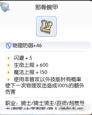 升级前:碎骨腕甲 闪避+5 生命上限+60 升级过程 I 煤炭*40,沙金*60,雪勒结晶*180, II 水银*50,死人遗骨*60,觉醒药水*25,刹勒空结晶*279 III 兽人指甲*2,铠甲碎片*50,深渊花*301,神之手*266 END 玫瑰石英*2,铠甲碎片*50,赛依伐*368,布里刊*388 升级之后:邪骨腕甲 闪避+5 生命上限+600 魔法上限+150 使用技能时有概率使下一次任何攻击造成100%的额外伤害 秘银之衣→秘银法袍