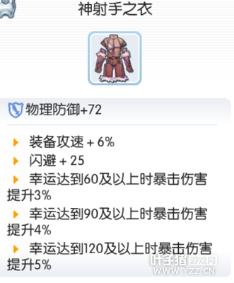升级前:龙之衬衣 装备攻速+3% 闪避+25 升级过程 I 黄宝石*10,沙金*40,坚硬外皮*275,火箭矢*10000 II 黄宝石*15,死人遗骨*60,水银*60,刹勒空结晶*347 III 黄宝石*15,铠甲碎片*50,触角*2,布里刊*322 END 黄宝石*20,铠甲碎片*50,黑云母*2,泯灭之心*392 升级之后:神射手之衣 装备攻速+6% 闪避+25 Luk达到60/90/120以上时暴击伤害提升3%/4%/5% 哥夫内肩饰→多芙的斗篷