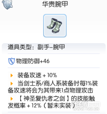 升级前:狐纹腕甲 装备攻速+5% 升级过程 I 沙金*40,天蓝宝石*20,玻璃珠*327, II 死人遗骨*50,水银*50,布里刊*452,红玛瑙*5 III 断柄之刃*20,铠甲碎片*70,铃铛*2,深渊花*452 END 断柄之刃*35,铠甲碎片*70,水晶镜子*3,泯灭之心*473 升级之后:华贵腕甲 装备攻速+10% 当剑士系/商人系装备时每5%装备攻速将会为其带来1点物理攻击 提升神圣复仇者技能触发概率 龙之衬衣→神射手之衣