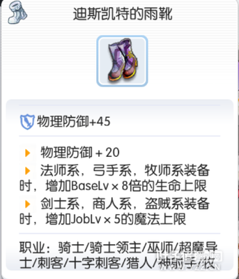 升级前:迪斯凯特的便靴 法师系,弓手系,牧师系装备时,增加BaseLv×5倍的生命上限 剑士系,商人系,盗贼系装备时,增加JobLv×2的魔法上限 升级过程 I 曼陀罗*15,钢铁*40,粘稠液体*250,坚硬外皮*312 II 曼陀罗*20,沙金*50,玻璃珠*346,恶魔角*425 III 曼陀罗*25,水银*60,触角*2,布里刊*362 END 曼陀罗*25,铠甲碎片*70,龙鳞*2,泯灭之心*331 升级之后:迪斯凯特的雨靴 物理防御+20 法师系,弓手系,牧师系装备时,增加BaseLv×8倍的MaxHP 剑士系,商人系,盗贼系装备时,增加JobLv×5的MaxSP 生存斗篷→高等生存斗篷