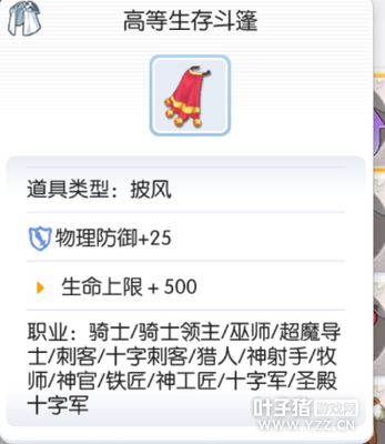 升级前:生存斗篷 生命上限+75 升级过程 I 白色药水*100,坚硬外皮*250,绿色染料*10, II 体质料理B*10,沙金*50,恶魔角*250,雪勒结晶*252 III 珍珠*2,铠甲碎片*50,深渊花*368,天地树果实*10 END 缎带*2,铠甲碎片*50,赛依伐*316,布里刊*328 升级之后:高等生存斗篷 生命上限+500 碎骨腕甲→邪骨腕甲