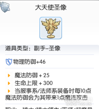 升级前:守护天使圣像 魔法防御+15 生命上限+100 升级过程 I 沙金*40,刹勒空结晶*284,雪勒结晶*240, II 死人遗骨*50,水银*50,玻璃珠*311,慧眼*305 III 柔软的羽毛*2,铠甲碎片*50,深渊花*352,神之手*487 END 玫瑰石英*2,铠甲碎片*50,泯灭之心*372,白色染料*2 升级之后:大天使圣像 魔法防御+25 生命上限+300 服事系、法师系装备时每10点装备魔法防御会为其带来1点魔法攻击 金色手镯→芬特克的手环