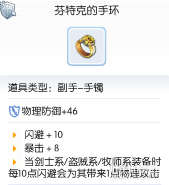升级前:金色手镯 闪避+5 暴击+5 升级过程 I 沙金*40,钢铁*65,刹勒空结晶*275, II 死人遗骨*50,水银*50,布里刊*452,神之金属*10 III 断柄之刃*20,铠甲碎片*70,兽人英雄之证*2,深渊花*460 END 断柄之刃*35,铠甲碎片*70,黑云母*3,赛依伐*499 升级之后:芬特克的手环 闪避+10 暴击+8 当剑士系、盗贼系。牧师系装备时每10点闪避会为其带来1点物理攻击 狐纹腕甲→华贵腕甲